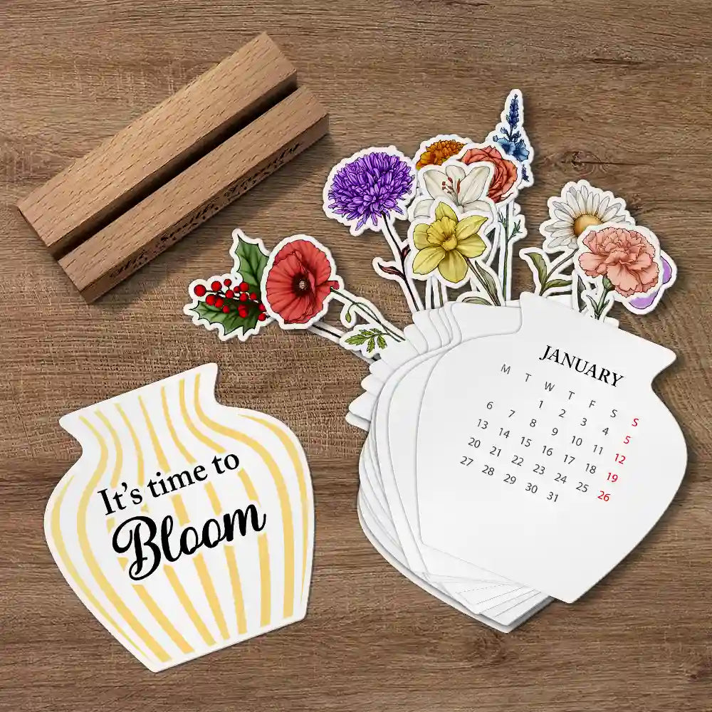 This happy and delightful calendar features birth month flowers, making it an appreciated and personalized gift for anyone you cherish. The custom shaped cardstock and sturdy wooden stand ensure it stands out as a charming addition to any desk or table. Its vibrant design and thoughtful layout allow recipients to enjoy a year full of love and beautiful memories.
