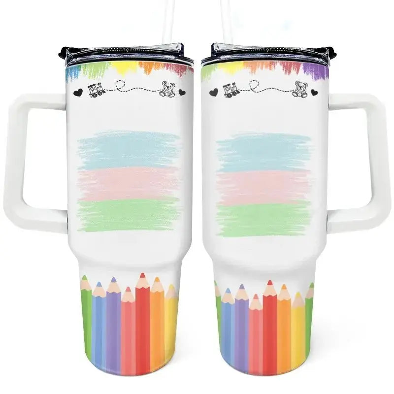 • These stainless steel 40oz tumblers with handle are personalized with the name of your choice. These fit in cup holders and is made of high quality stainless steel.