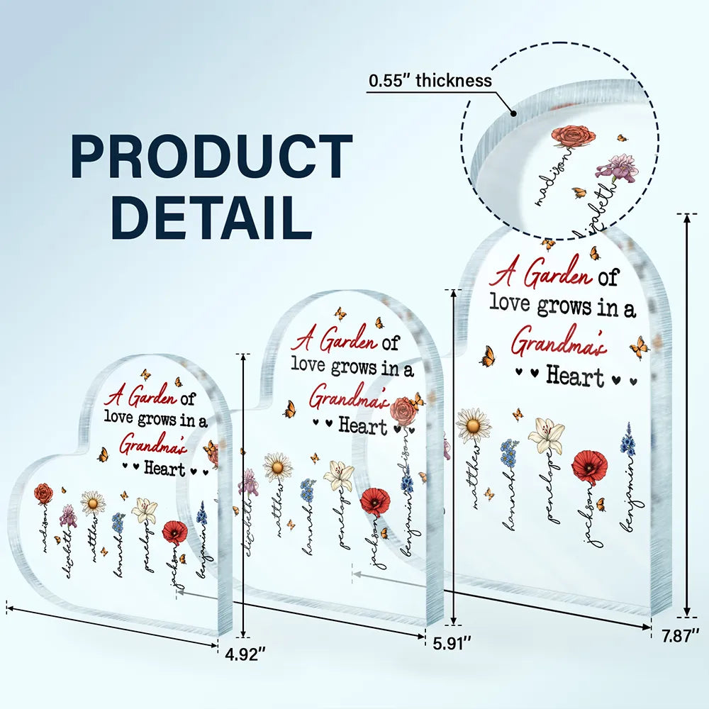 Celebrate the love and special moments with the “A Garden Of Love Grows In A Grandma's Heart - Personalized Heart Shaped Acrylic Plaque.” This heartfelt and unique plaque makes an ideal gift for Grandma, Mom, or Aunt on occasions like Mother’s Day, Thanksgiving, Christmas, birthdays, and anniversaries. Customizable with a name, it offers a personal touch that makes each gift unforgettable.