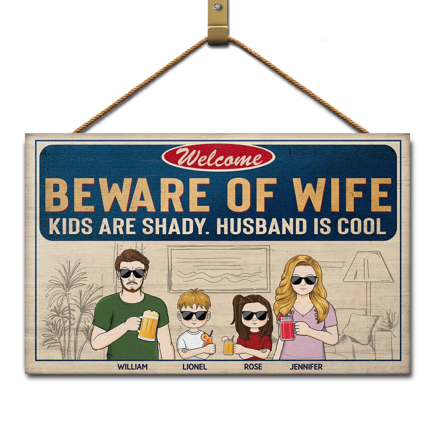 Welcome beware of wife kid is shady husband is cool''.