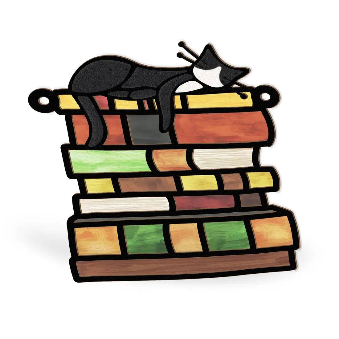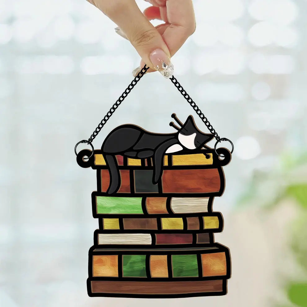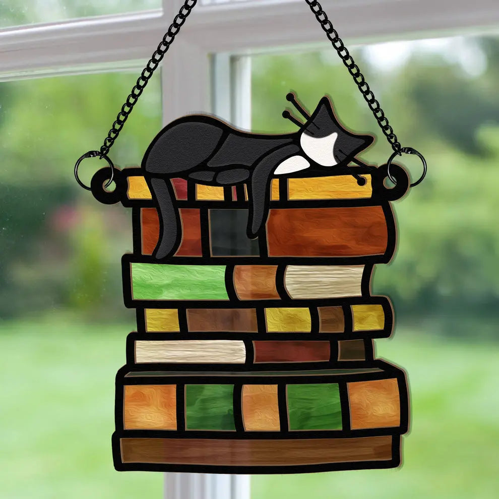 Cat Sleeping On Books - Personalized Window Hanging Suncatcher Ornament Hanging Suncatcher Ornament The Next Custom Gift