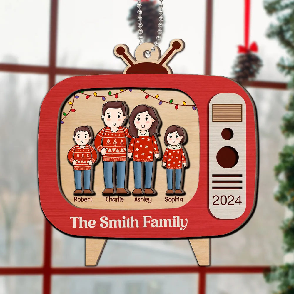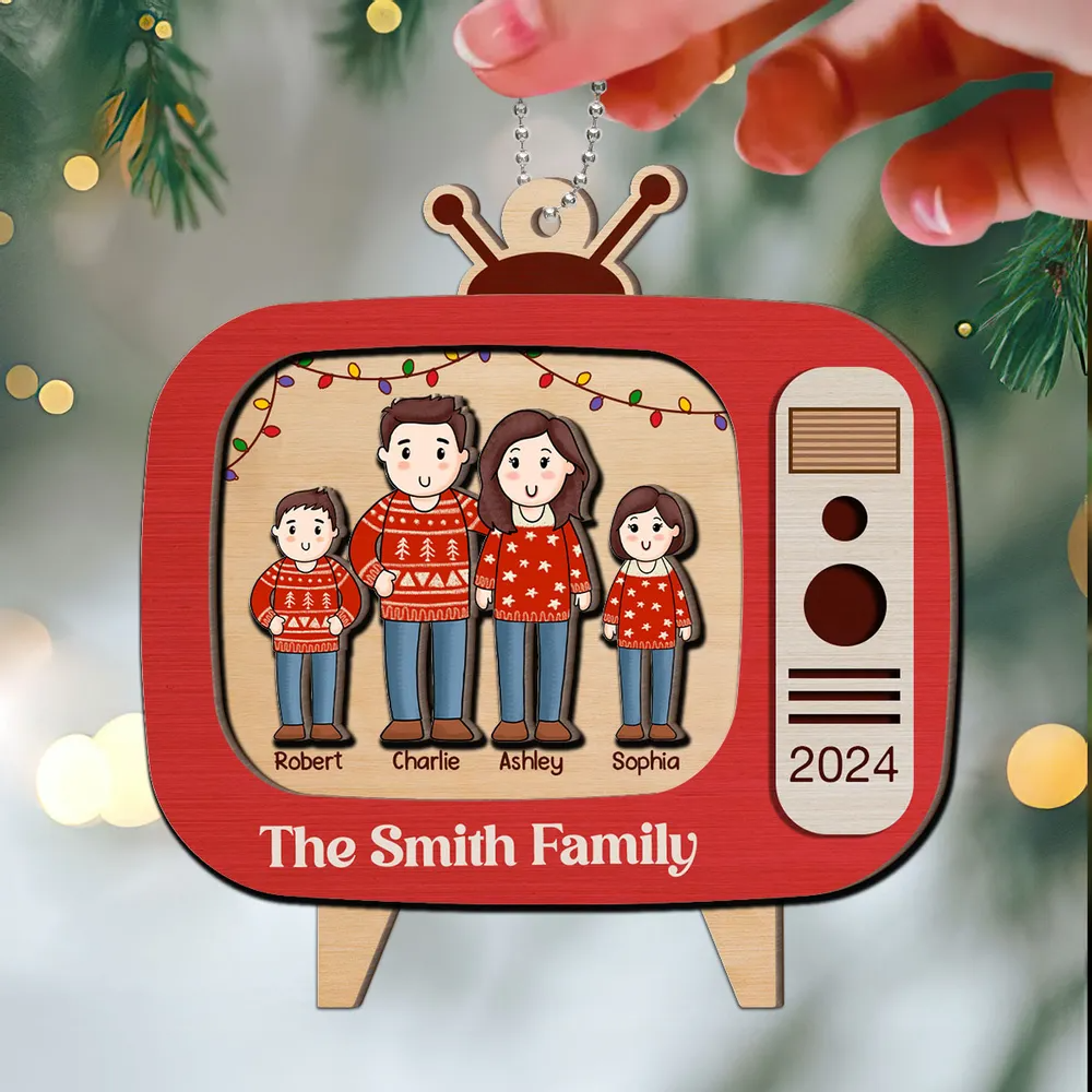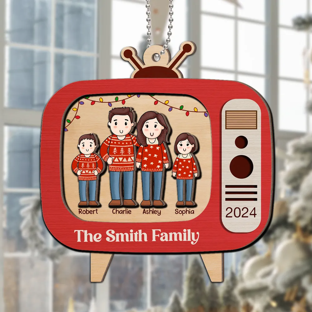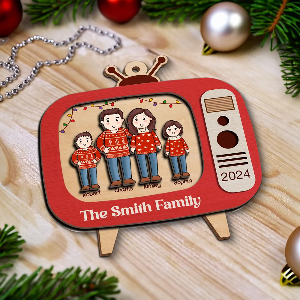 Comic Family In Christmas Red Retro Televison Personalized Wooden Ornament