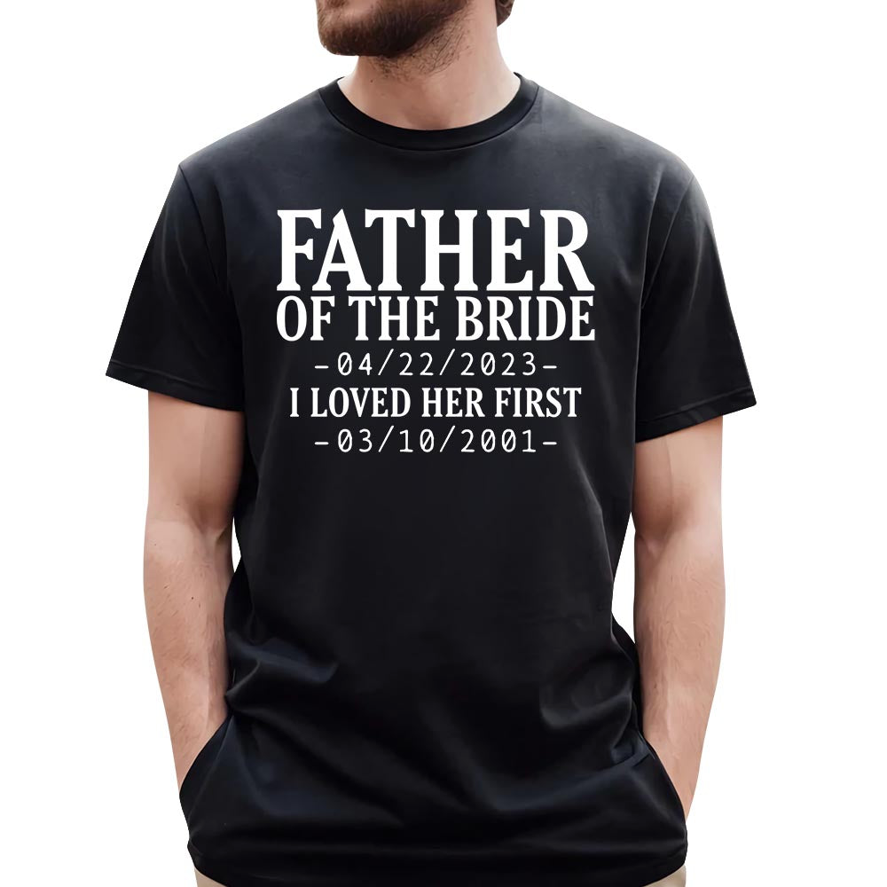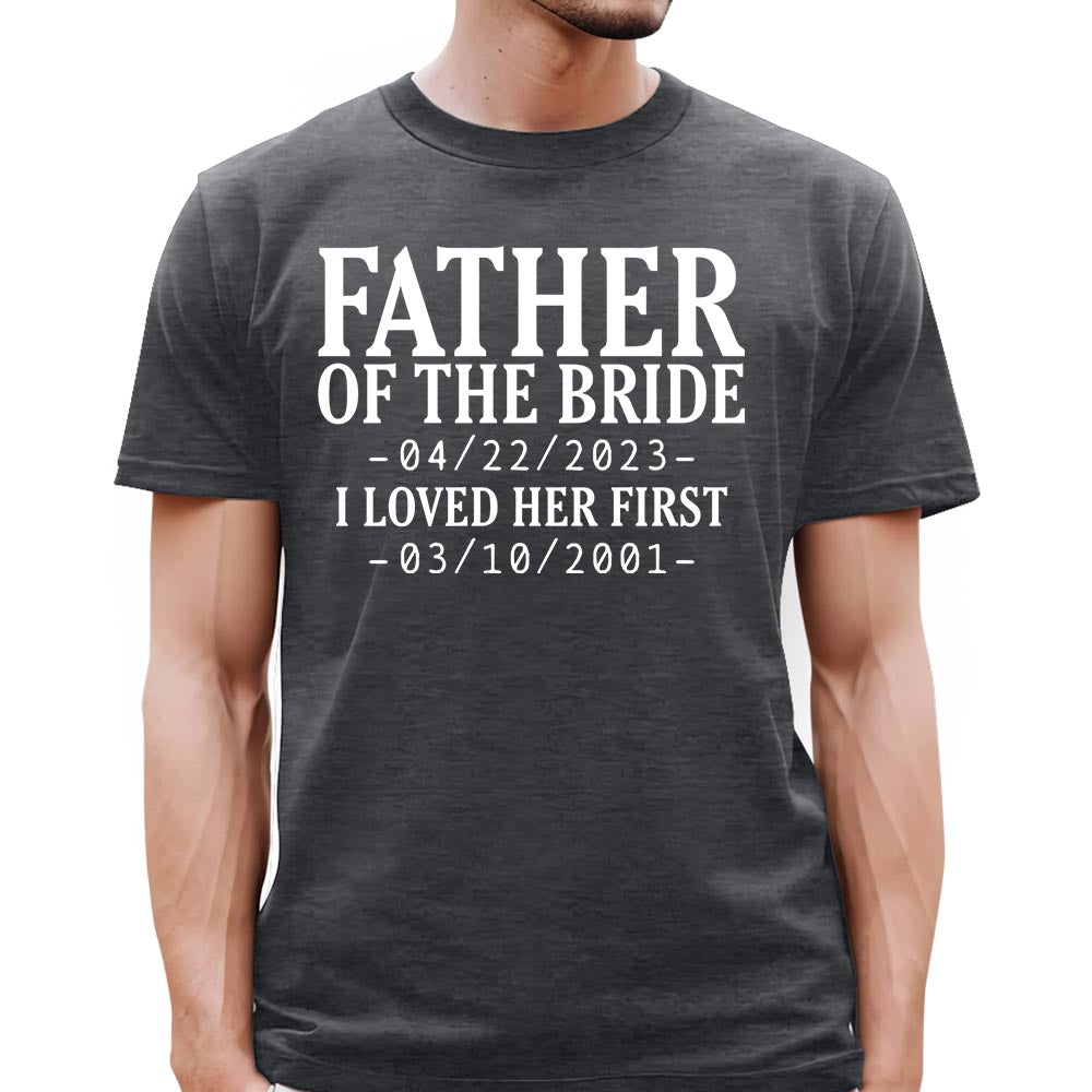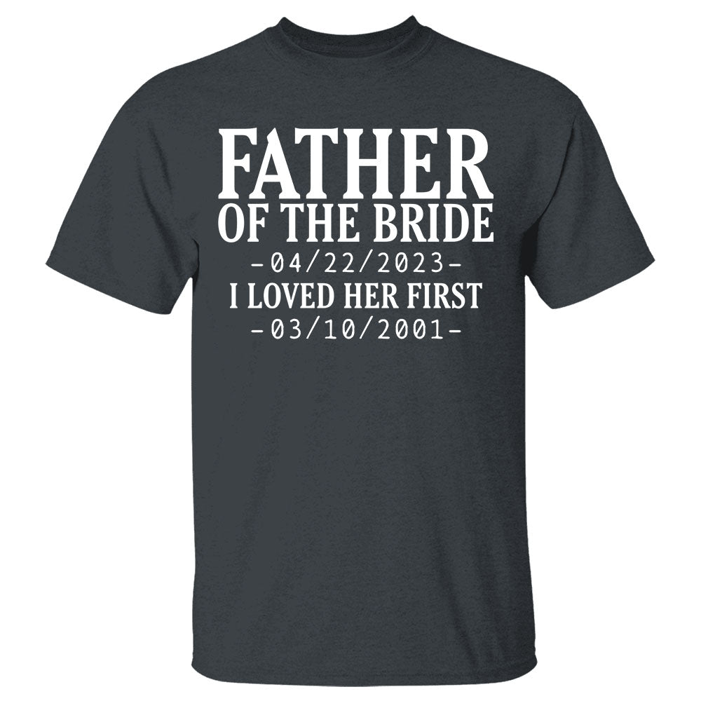 Custom Father Of The Bride I Loved Her First With Wedding Date And Birth Date Shirt For Dad
