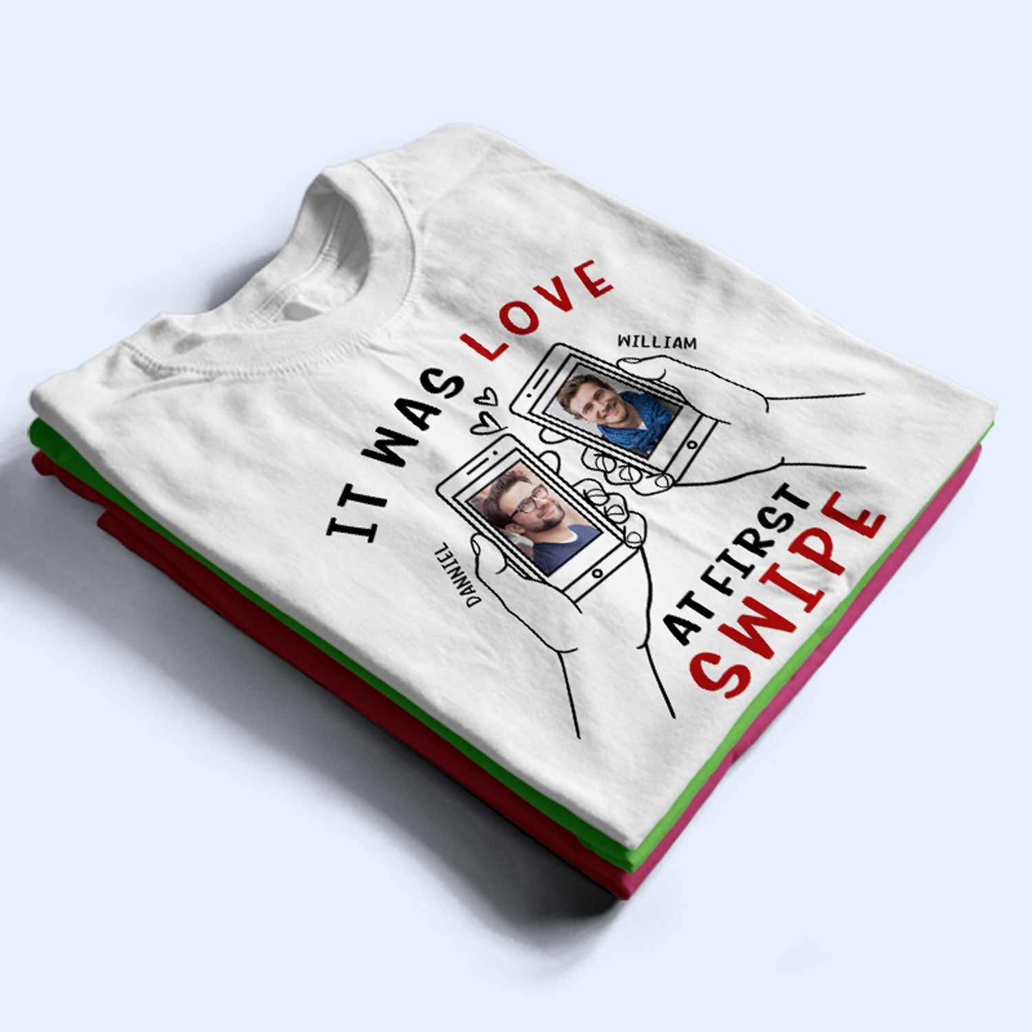 Description: Funny personalized t-shirt for couples! All because two swiped right!