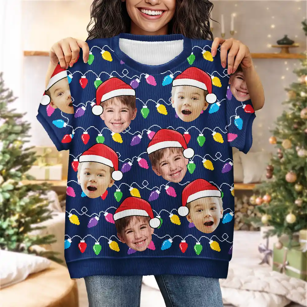 Custom Photo Santa Hat Funny Family Face - Personalized Short Sleeve Sweater