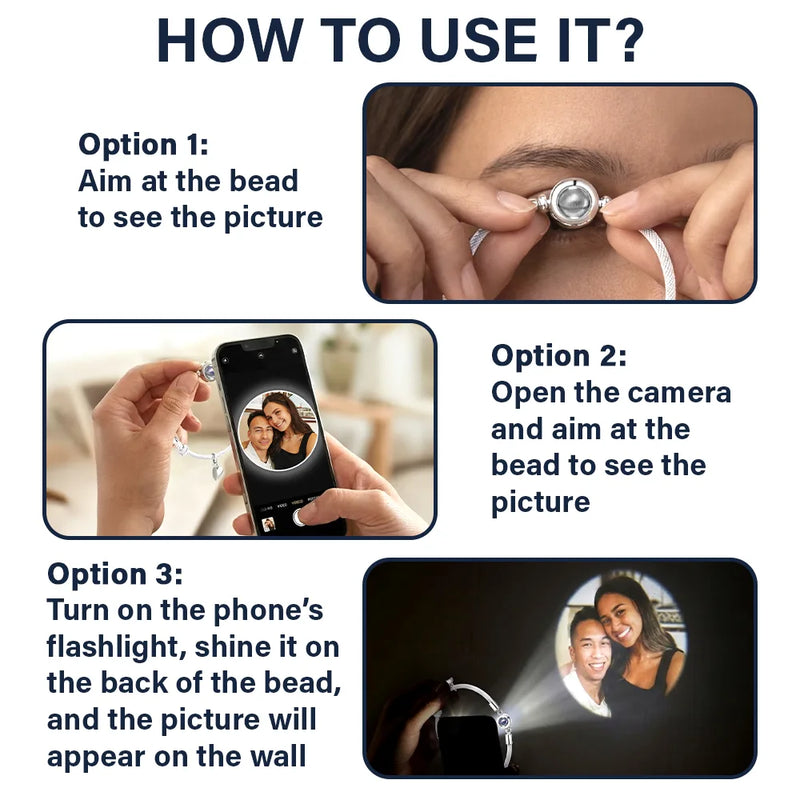 • Hidden meaning - Designed with a photo projection charm and an engraved magnetic heart, this bracelet keeps a personal image and message close, revealing a meaningful photo through a subtle, intimate projection.
