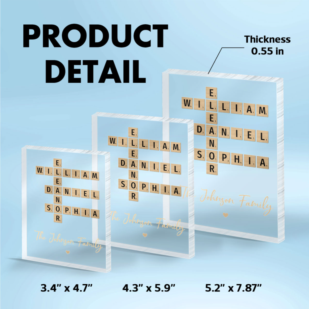 - 💡 Exclusive Family Crossword Design: Inspired by the love of family, your names are uniquely interconnected into a creative and meaningful layout.