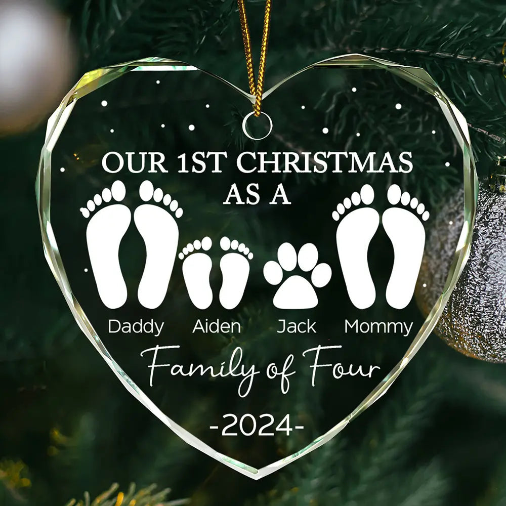 First Christmas As A Family Of Four Footprints - Personalized Heart Shaped Acrylic Ornament
