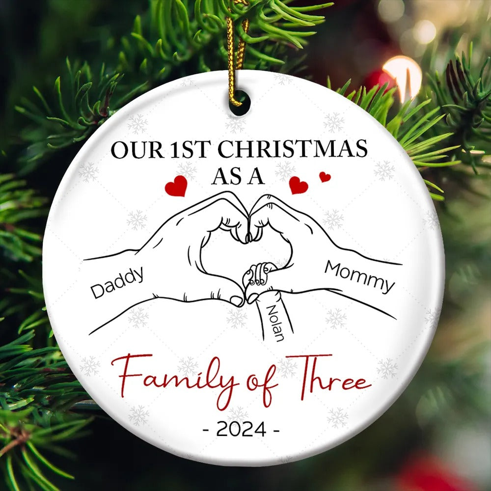 First Christmas As A Family Of Three Hand Heart - Personalized Circle Acrylic Ornament
