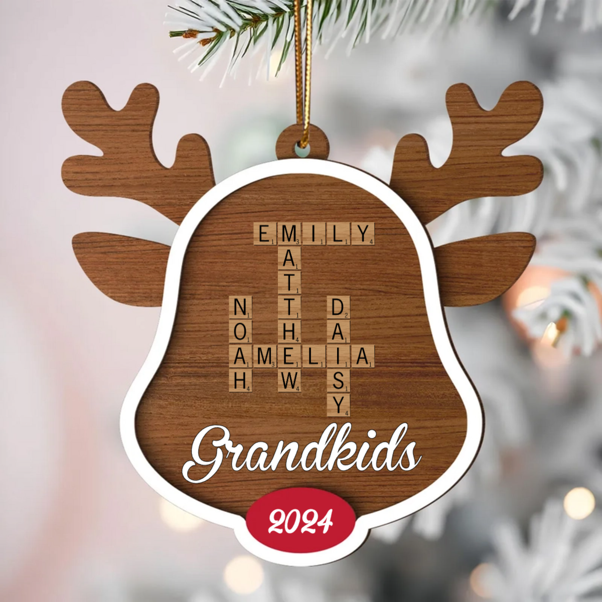 Grandkids Names Reindeer Crossword Puzzle Art Personalized Wooden Ornament, Christmas Gift For Grandma