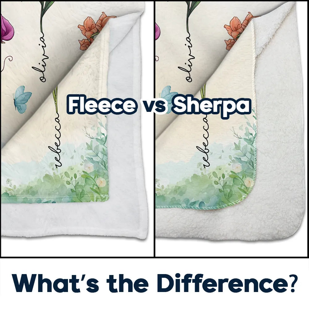 Wrap your loved ones in warmth and love with the "Grandma Nana's Garden Birth Month Flower" Personalized Fleece Blanket. Ideal as a Gift For Grandma, Mother, or Aunt on Mother's Day, Thanksgiving, Christmas, birthdays, and anniversaries, this cozy Sherpa blanket combines functionality with a personal touch.