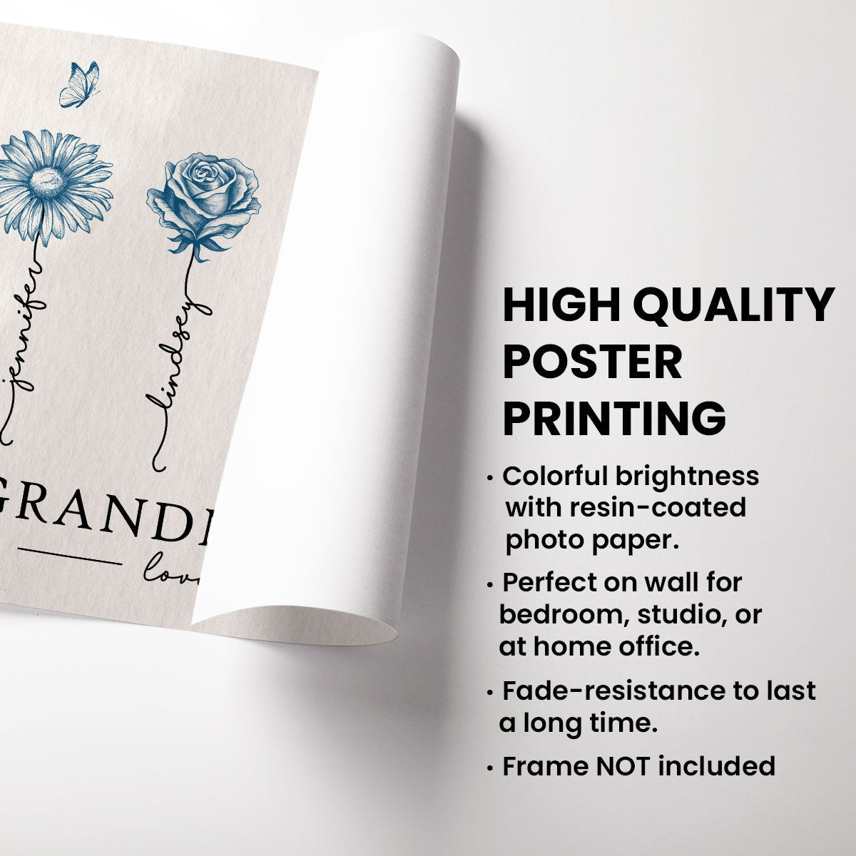 Grandma's Garden Love Grows Here Blue Vingtage Birthmonth Flowers Personalized Poster, Grandkids Names Floral Gift