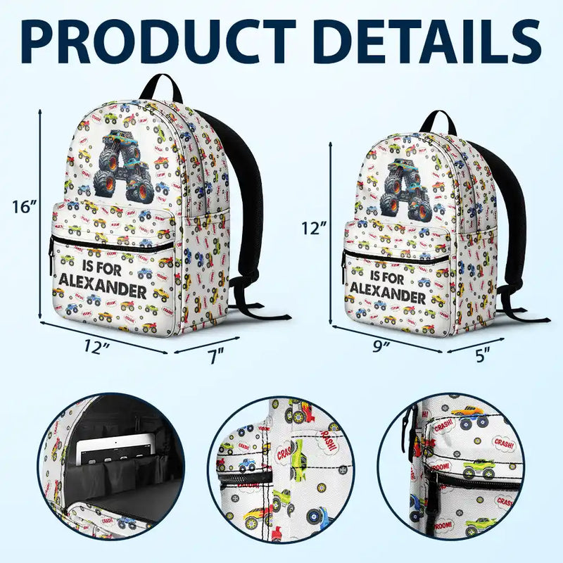 Kid Monster Truck Toy Container Monogram Initial - Personalized Canvas Backpack