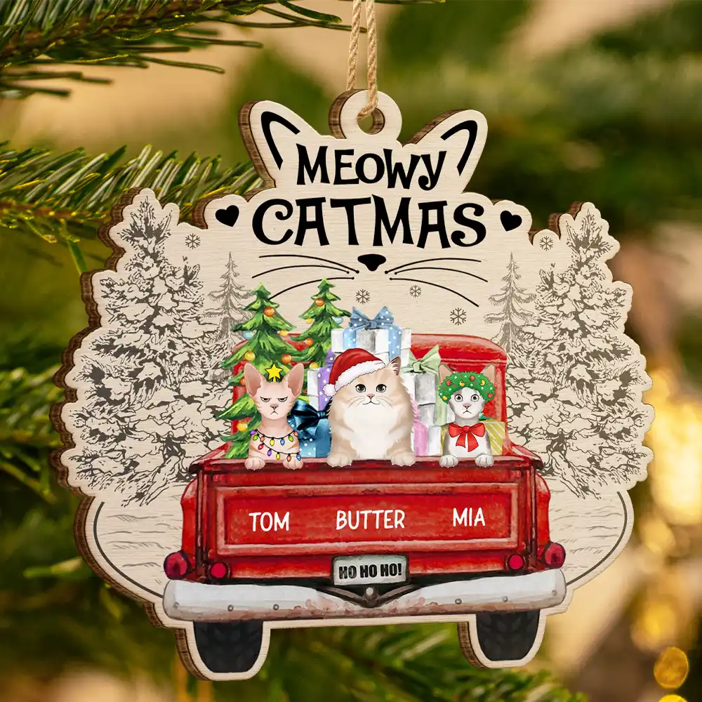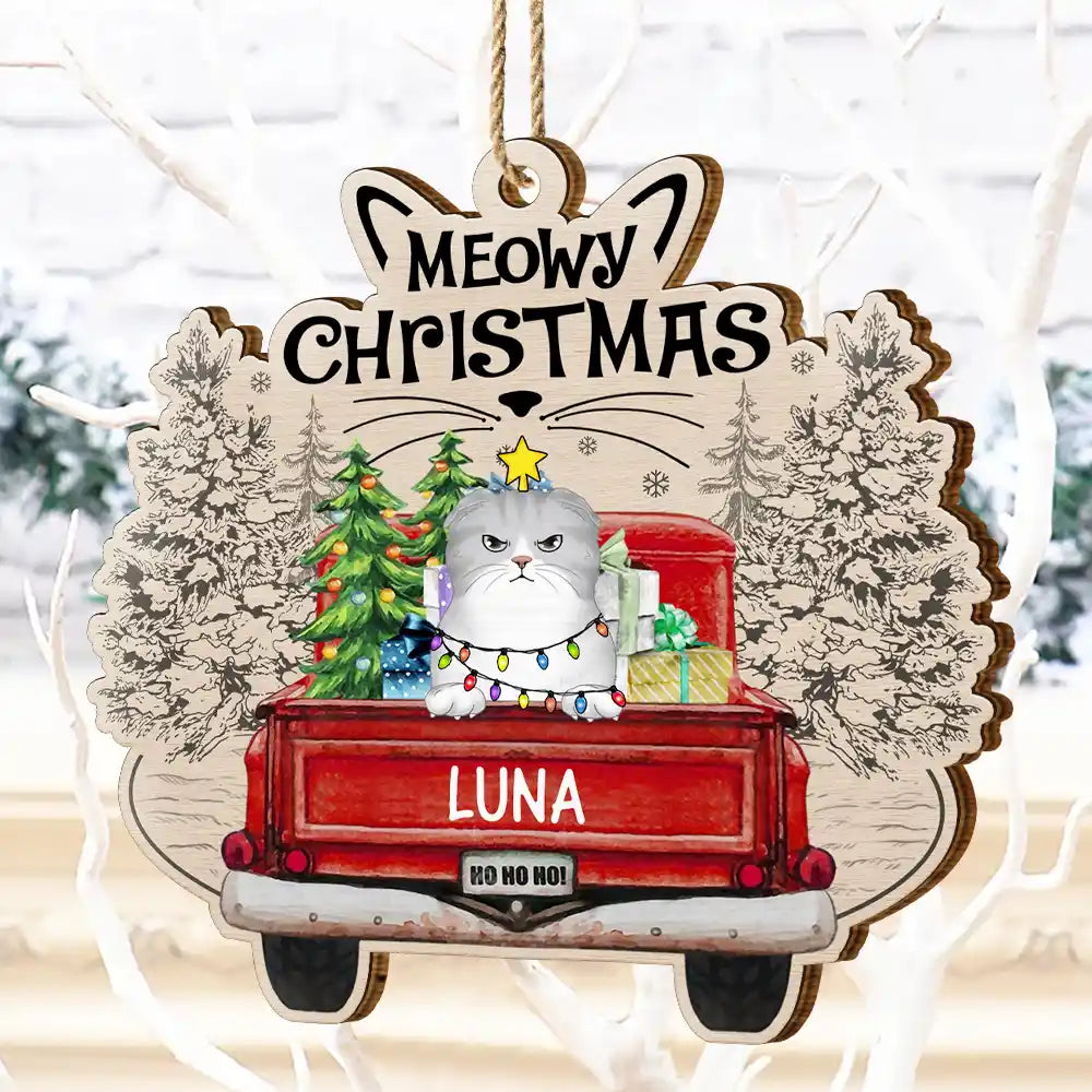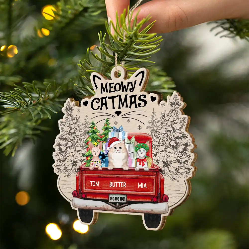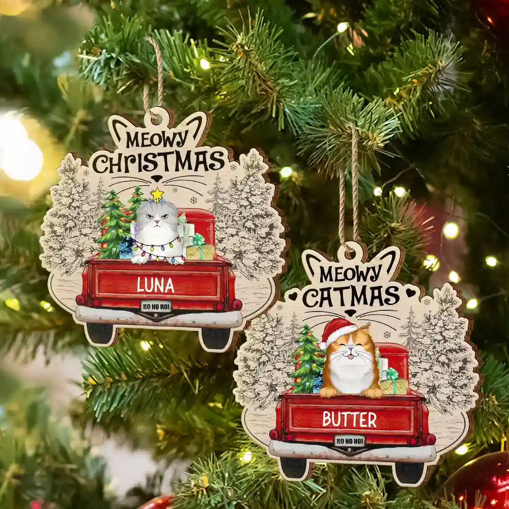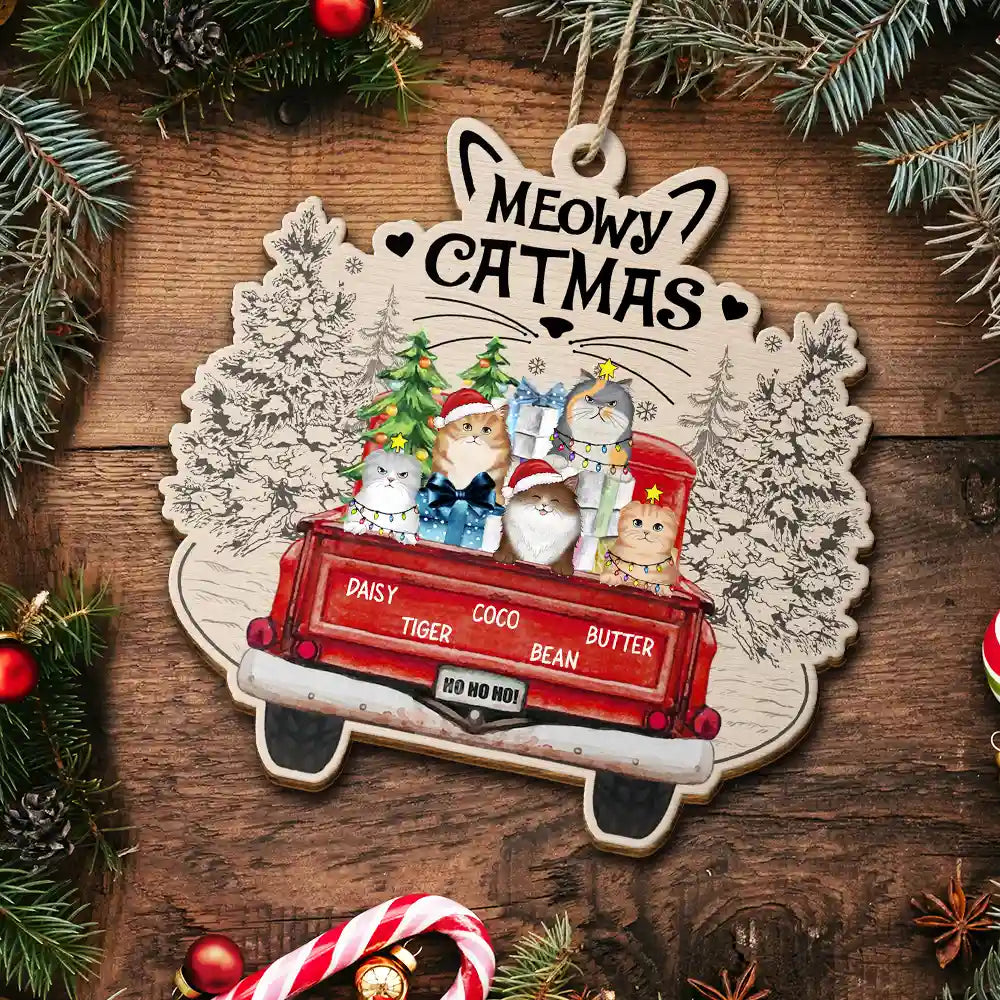 Meowy Catmas Christmas Cats In Red Truck - Personalized Custom Shaped Wooden Ornament