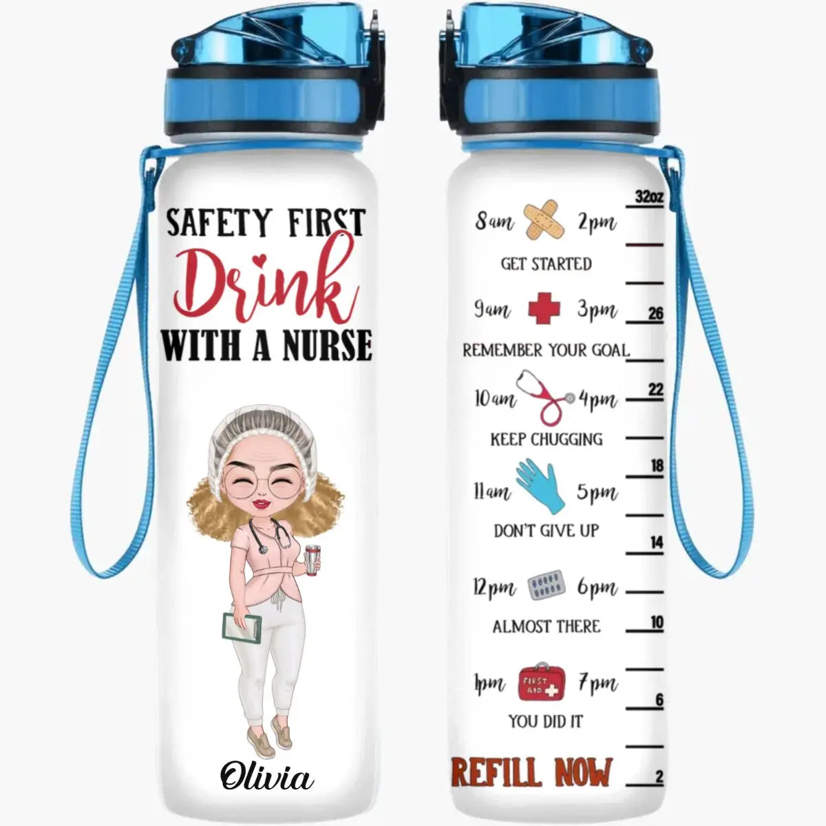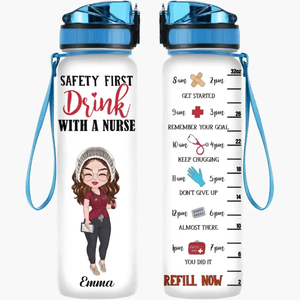 Nurse - Safety First Drink With A Nurse - Personalized Water Tracker Bottle Tracker Bottle The Next Custom Gift