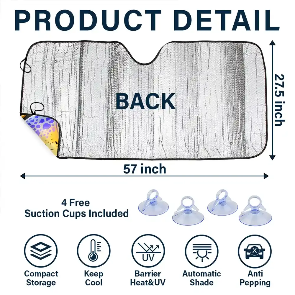 • Feature: Fits most cars, trucks and SUVs, provides protection against UV rays and sun damage while reducing interior heat – no more fading & heat damage. Durable to use, lightweight and portable, easy to install and remove (no harm to your windshield).