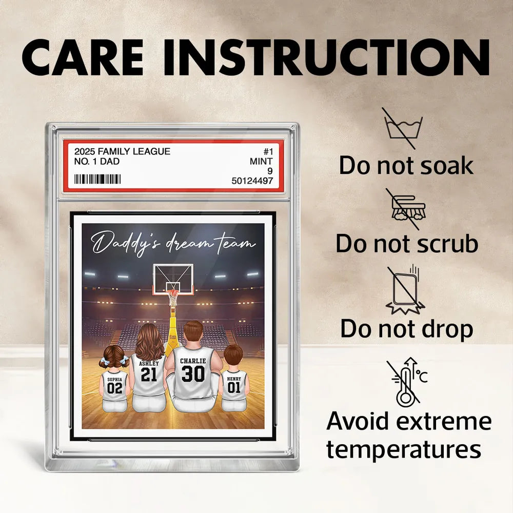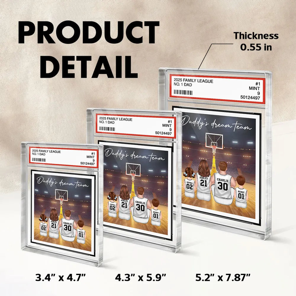 Basketball Daddy's Dream Team No. 1 Dad Man & Kids Sitting Trading Card Style Personalized Acrylic Block Plaque