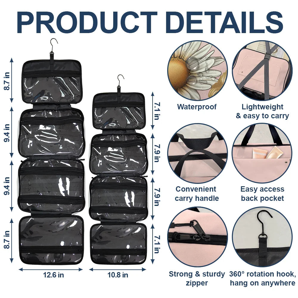Whether you're heading out on a weekend getaway or embarking on an international adventure, this awesome travel companion keeps your toiletries, cosmetics, and small accessories neat and accessible. Its compact yet spacious design makes it easy to pack in your luggage, gym bag, or carry-on. Use it to store your skincare favorites, makeup, or even your favorite travel trinkets.