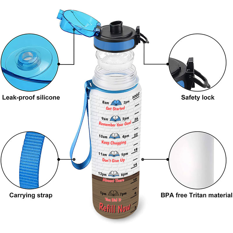 • Our Water Tracker Bottle makes things easy. With a time marker measuring how much water you should be drinking hour-by-hour, you can stay on track with your water consumption each day.