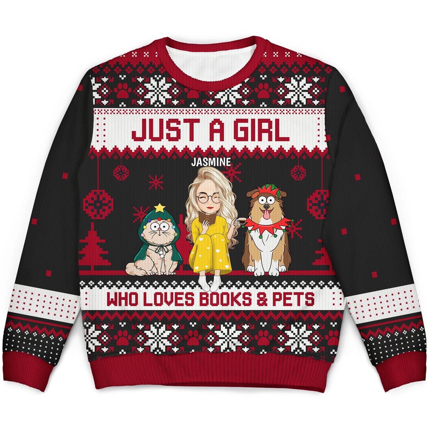 Christmas Reading Girl Who Loves Books & Pets - Gift For Book Lovers. Pet Lovers - Personalized Unisex Ugly Sweater