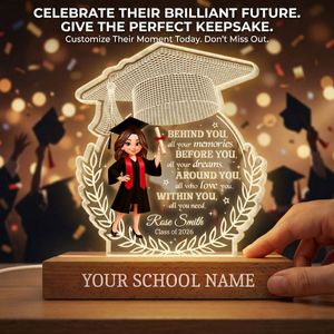 Celebrate a milestone that marks both an ending and a powerful new beginning with this inspiring personalized acrylic block LED night light. Designed to instantly capture attention with its elegant graduation cap motif and heartfelt message, this keepsake builds emotion as it reflects on memories made, dreams ahead, and support all around. Customized with a name, graduation year, and school, it becomes a deeply meaningful display that encourages confidence and pride—making it a perfect graduation day gift they’ll treasure long after the ceremony ends.