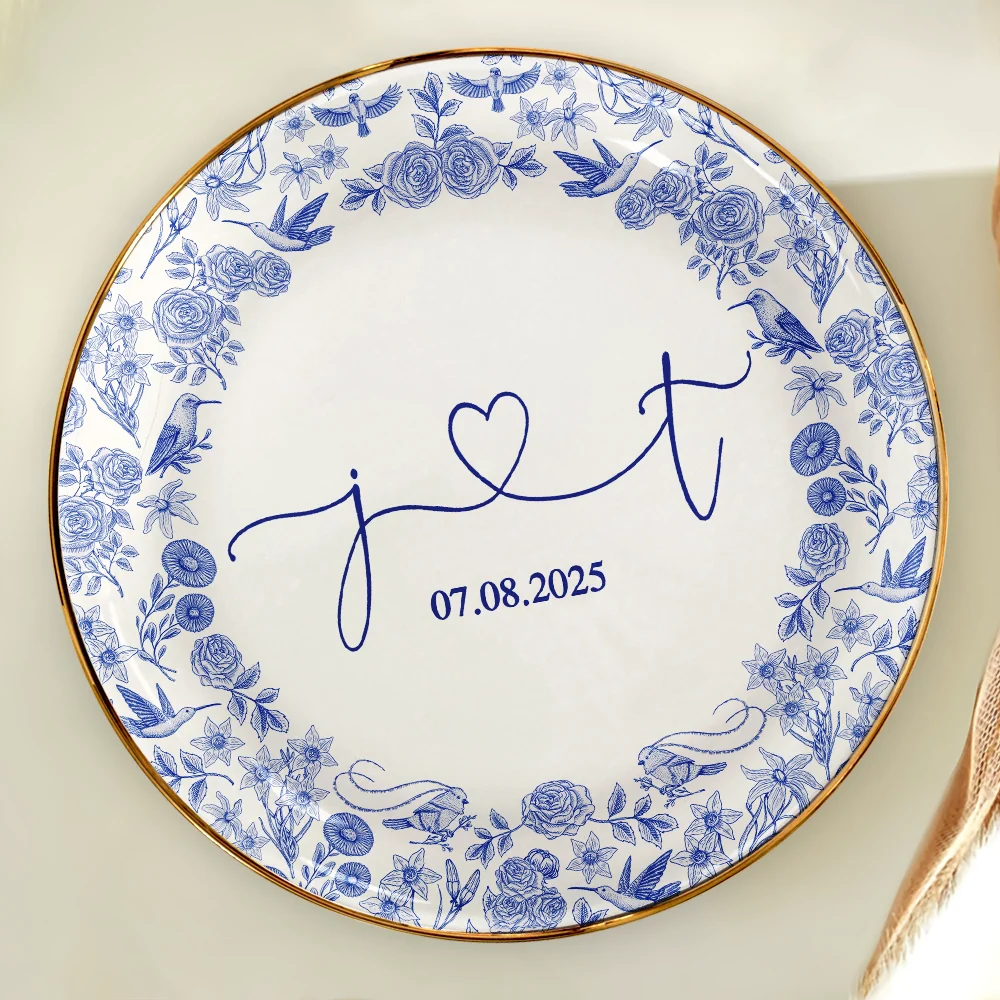 Use it to hold rings, earrings, or treasured keepsakes on your vanity, nightstand, or dresser. Featuring a timeless Toile de Jouy pattern, this unique ceramic dish can be customized with initials and a special date for a truly appreciated gift.