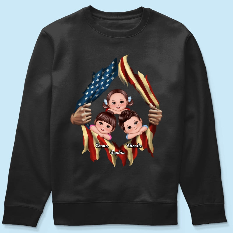 Looking for the perfect gift for Dad or Grandpa? This custom T-shirt featuring adorable kid's hands ripping open the American flag is the ideal way to show your love and appreciation.