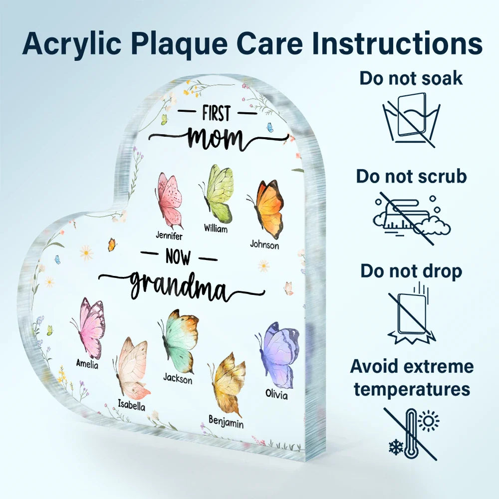 First Mom Now Grandma Butterfly - Personalized Heart Shaped Acrylic Plaque