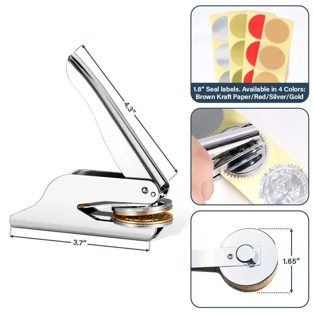 Measurement: Embosser - 4.33" x 3.74"(11cm × 9.5cm); Round Seal Diameter - 1.65"(4.2cm); Seal Label Diameter - 1.8"(4.5cm)