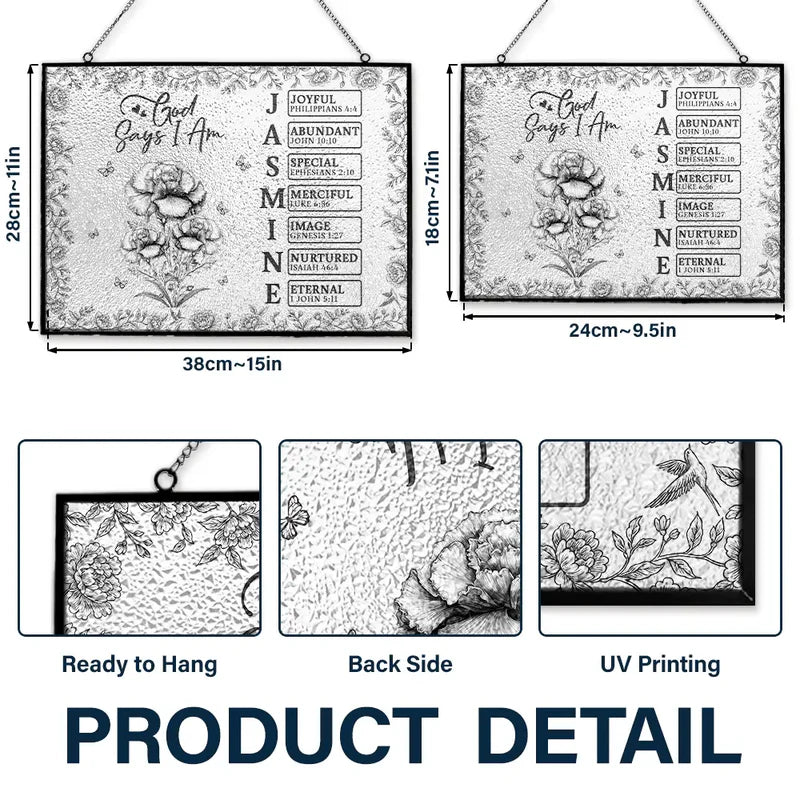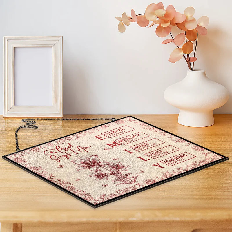 God Says I Am Toile De Jouy Flower - Personalized Horizontal Stained Glass Suncatcher