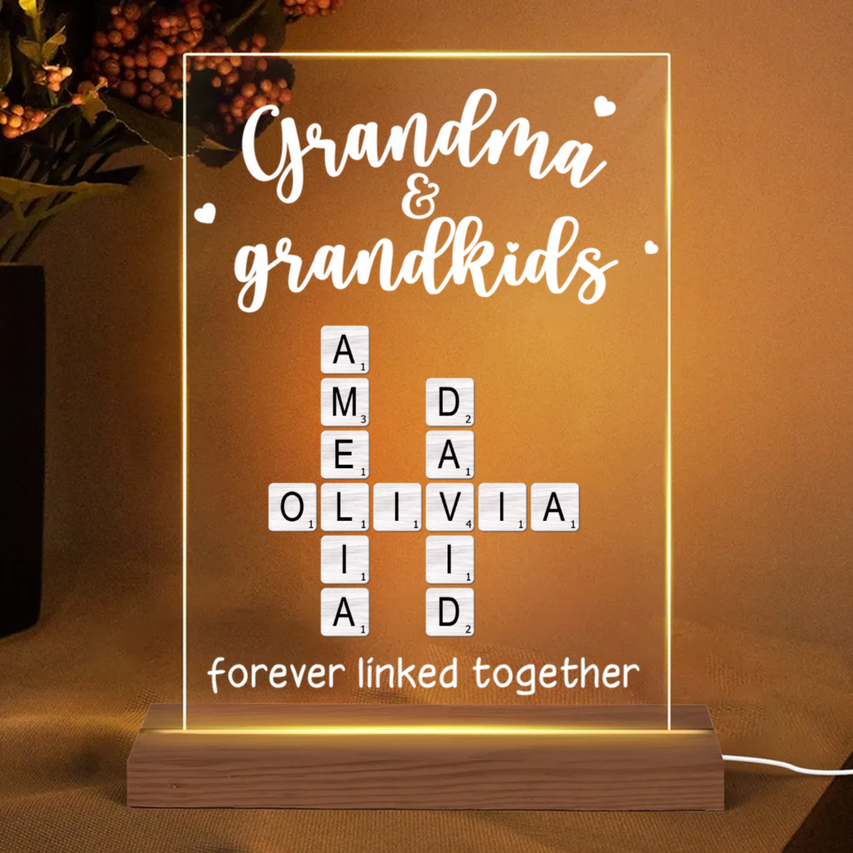 Transform your home decor into a celebration of family with our Custom Crossword Puzzle Led Night Light. Inspired by the popular Scrabble game, this unique feature allows you to easily input the names of your loved ones, and our system automatically generates a one-of-a-kind crossword design. This innovative feature is exclusive to us, making your decor truly unique.