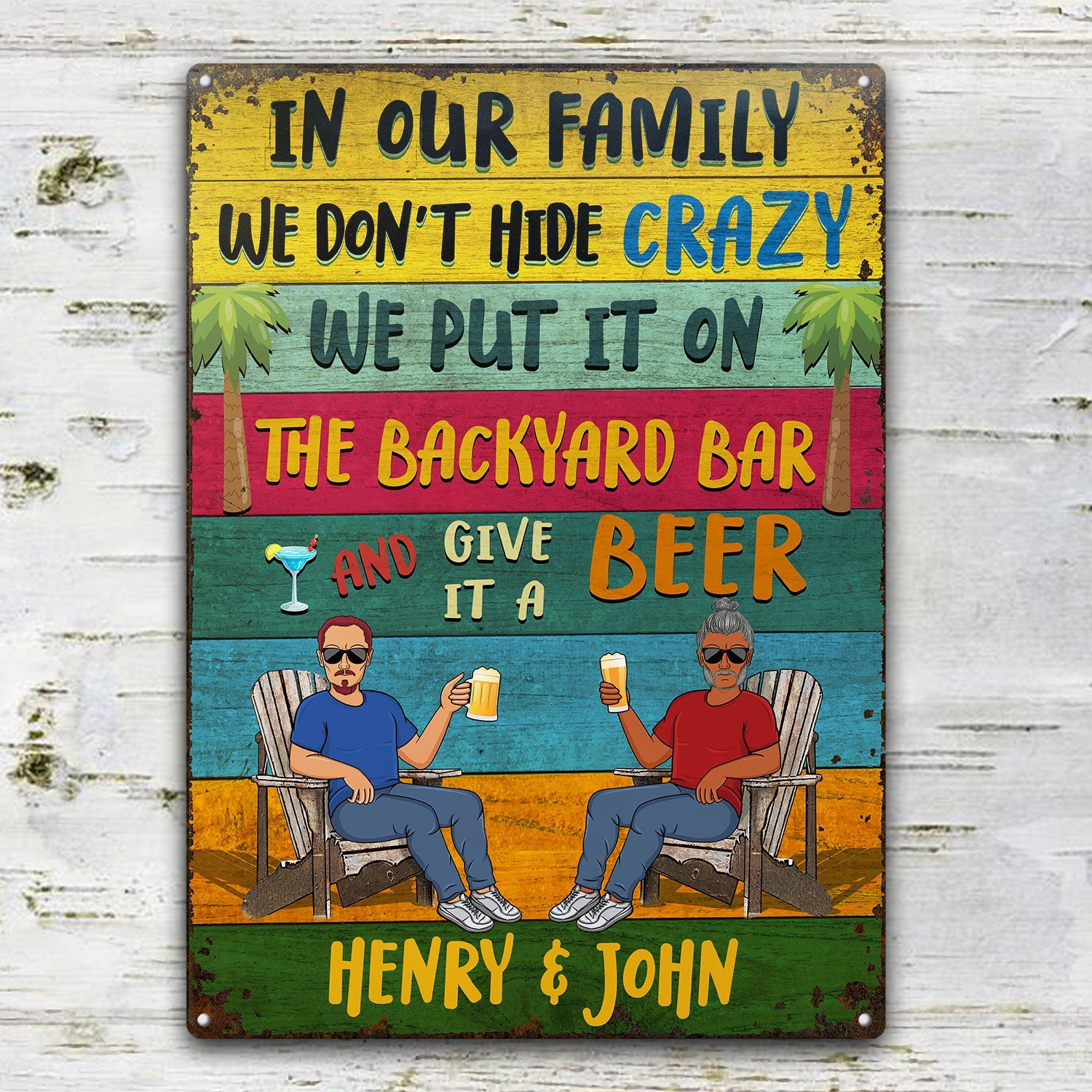 In Our Family We Don't Hide Crazy We Put It On The Porch Grilling - Home Decor, Backyard Decor, Gift For Her, Him, Family, Couples, Husband, Wife - Personalized Custom Classic Metal Signs