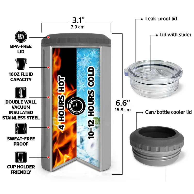 • MULTIPLE USES: Fits most 12oz slim can, 12oz standard can, 12oz glass bottle, and can be used as a 16oz tumbler by pouring a beverage directly into the vessel