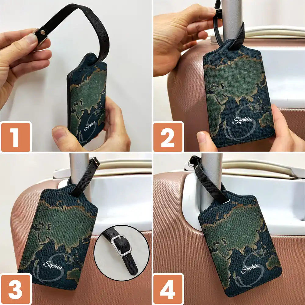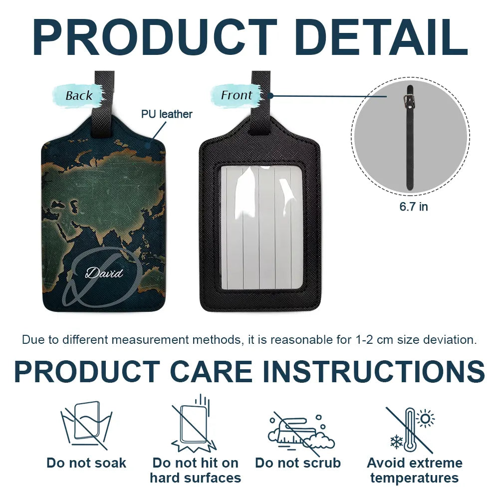 Crafted with attention to detail, the tag features a world map design with space for your monogram and name, creating a meaningful and cherished accessory. It's ideal for any occasion, whether for Thanksgiving, Christmas, birthday, anniversaries, or as a spontaneous gift to celebrate a new adventure.
