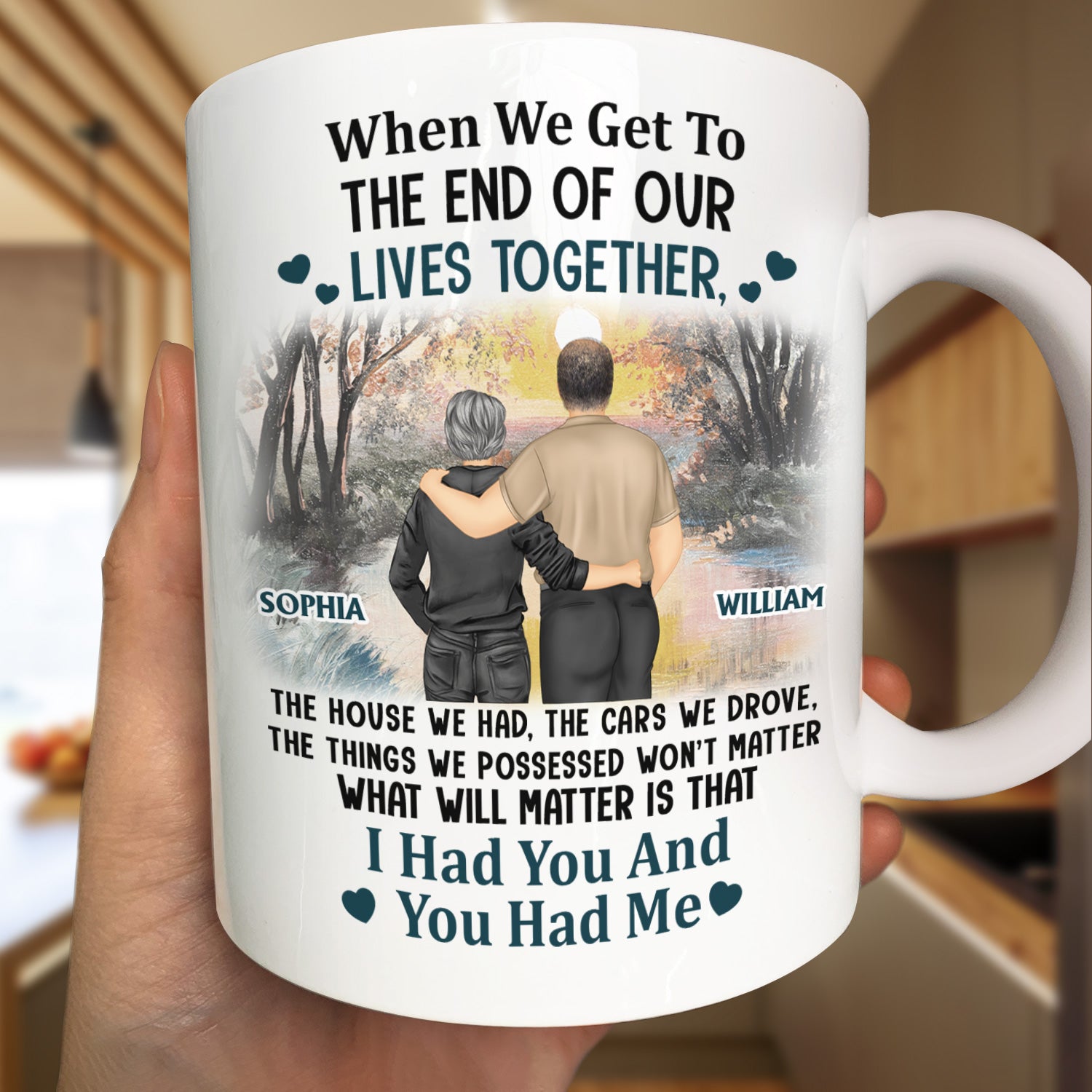 Celebrate enduring love with the Old Couple I Had You And You Had Me - Personalized Mug. This charming and sentimental mug is a perfect gift for couples, husbands, wives, moms, dads, boyfriends, or girlfriends on Valentine's Day, Mother's Day, Father's Day, Thanksgiving, Christmas, birthdays, and anniversaries. Its heartfelt message and unique design make it a meaningful keepsake for any occasion.