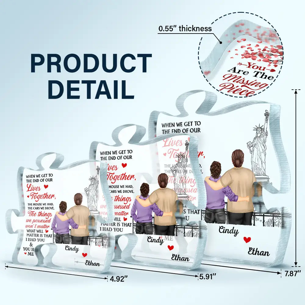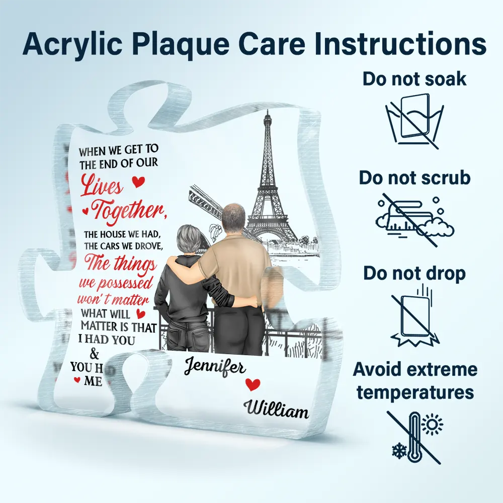 The Old Couple I Had You You Had Me - Personalized Puzzle Shaped Acrylic Plaque can be displayed in the living room, bedroom, or any space that celebrates love and togetherness. Its thoughtful design serves as a constant reminder of the bond shared between two people, making it a meaningful and cherished addition to any home. This personalized plaque is a perfect way to show how much you appreciate your loved one and the memories you’ve built together.