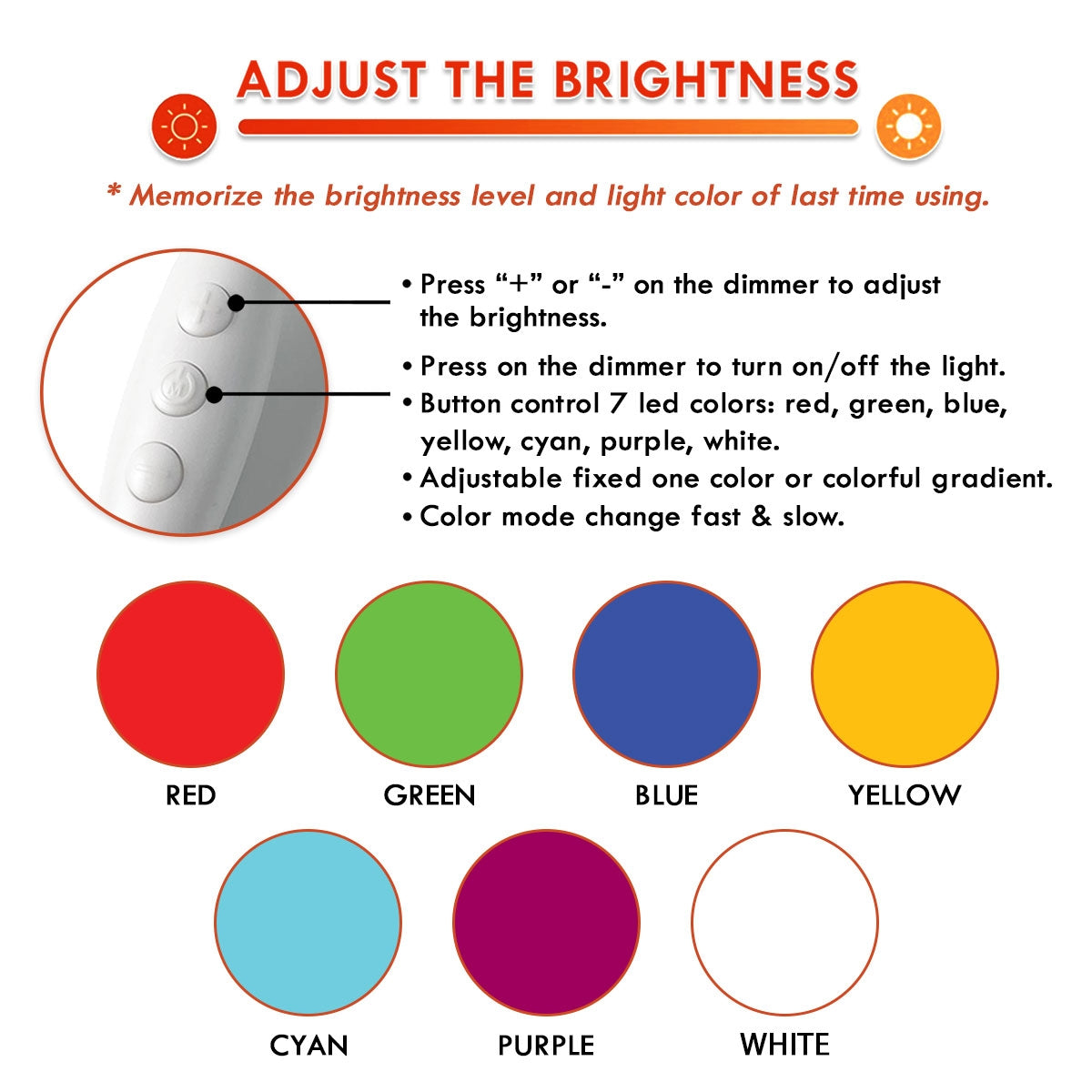 - Multi-color option: The light includes 7 different LED colors and all are easy to operate by button dimmer.