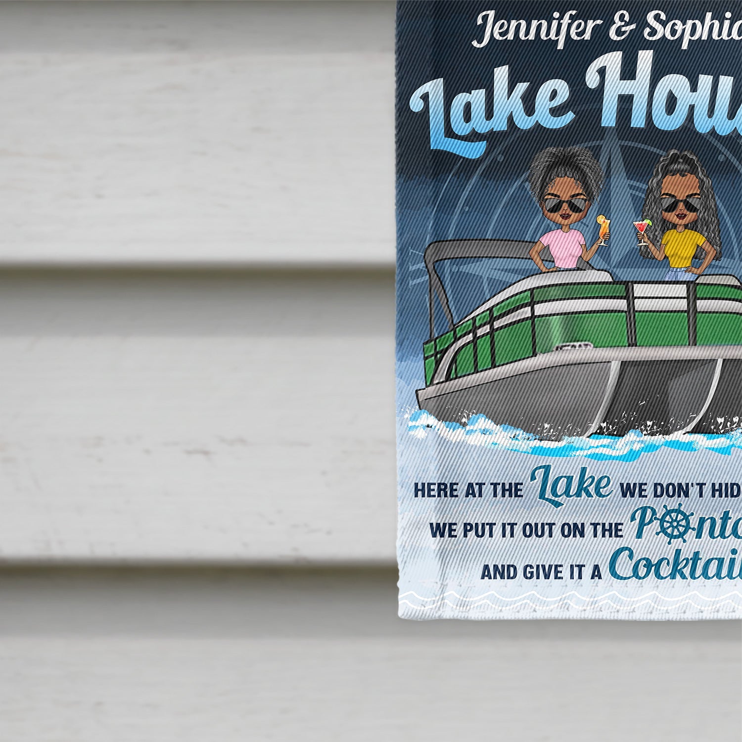 Message: "Lake house, here at the lake we don't hide crazy, we put it out on the pontoon and give it a cocktail".