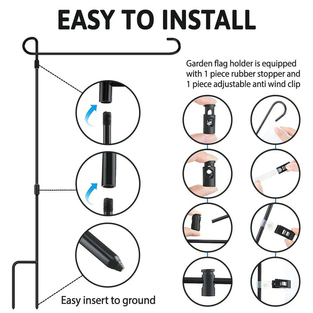 The garden flag stand is made of metal, with thickened grounding rod and reinforced welding point, which is stable and sturdy, not easy to bend or break, with the black powder coating, which is weather resistant and rust proof