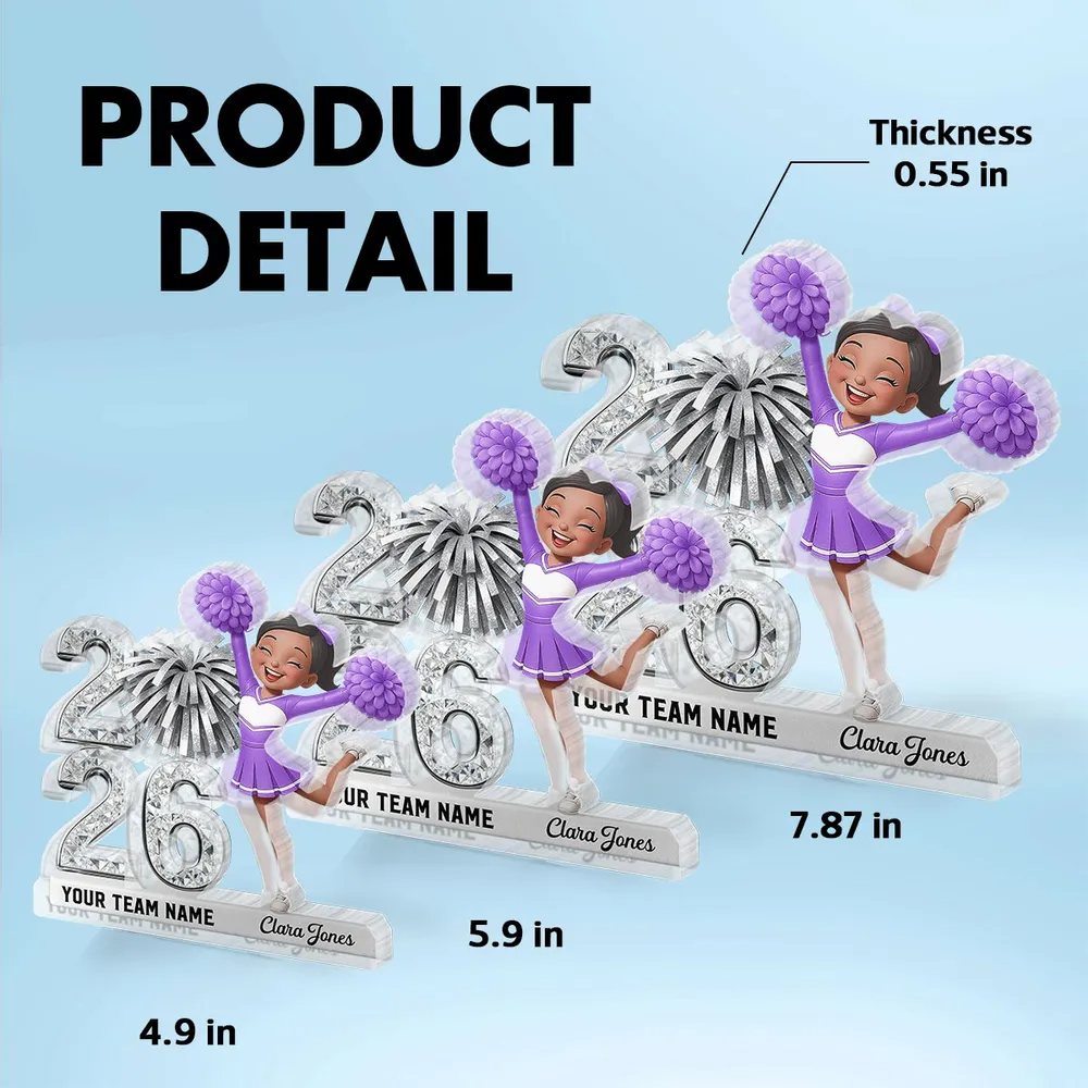 Celebrate spirit, dedication, and a milestone achievement with this eye-catching personalized acrylic block plaque designed for proud cheerleaders. Featuring a vibrant cheerleader illustration alongside a sparkling Class of 2026/2027 design, this piece instantly captures attention with its glossy, high-shine effect. Personalized with a name and team details, it transforms years of hard work, teamwork, and school pride into a keepsake she’ll be proud to display—making it a perfect graduation gift that honors both her academics and her passion.